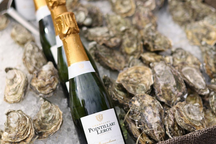 Umami can be combined with champagne by pairing dishes naturally rich in umami, such as oysters, Parmesan cheese, or mushroom risotto, with champagne that also contains umami components due to long aging on its lees. The synergy between the umami in the food and the acidity and bubbles of the champagne creates an enhanced, harmonious taste experience. Other umami-rich dishes that pair well include caviar, truffles, and seaweed dishes. Umami flavor is caused by free glutamate and free nucleotides, scientifically based on an allosteric effect on the umami receptor. This makes, for example, eggs and bacon with cheese and ham a delicious combination. Based on measurements of umami compounds in champagne and oysters, Vinther Schmidt, Karsten Olsen, and Loe Mouritsen suggest in Nature in 2020 that champagne and oysters are a good combination, possibly due to the presence of free glutamate in champagne and free glutamate and 5'-nucleotides in oysters.